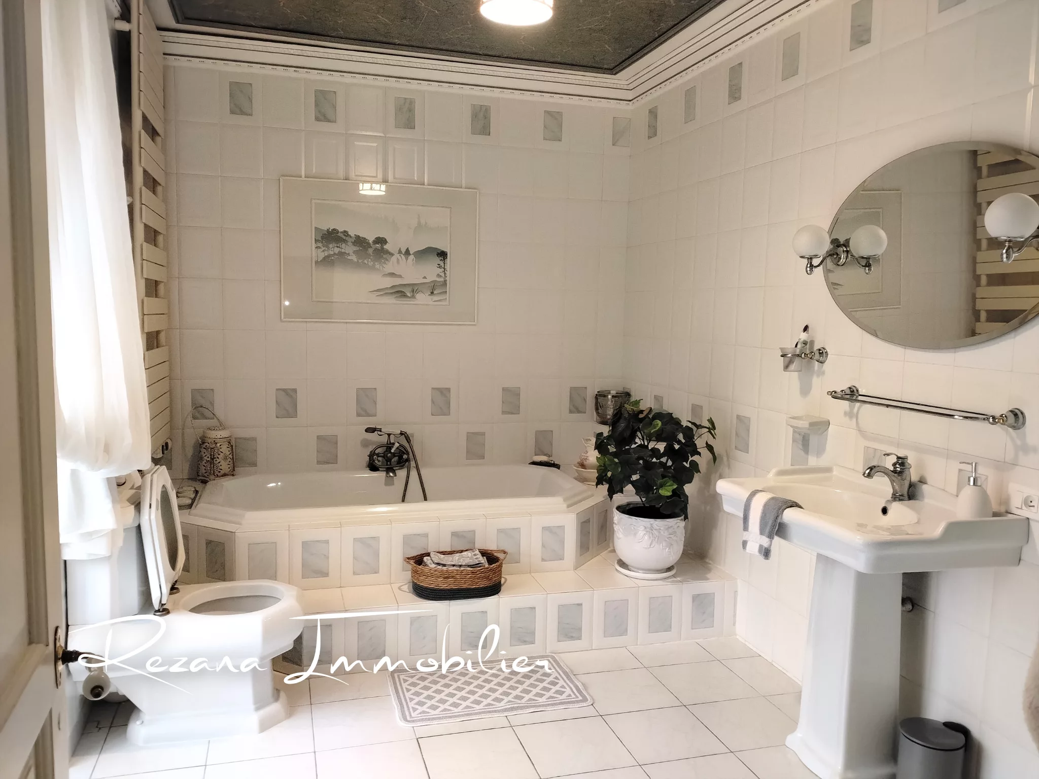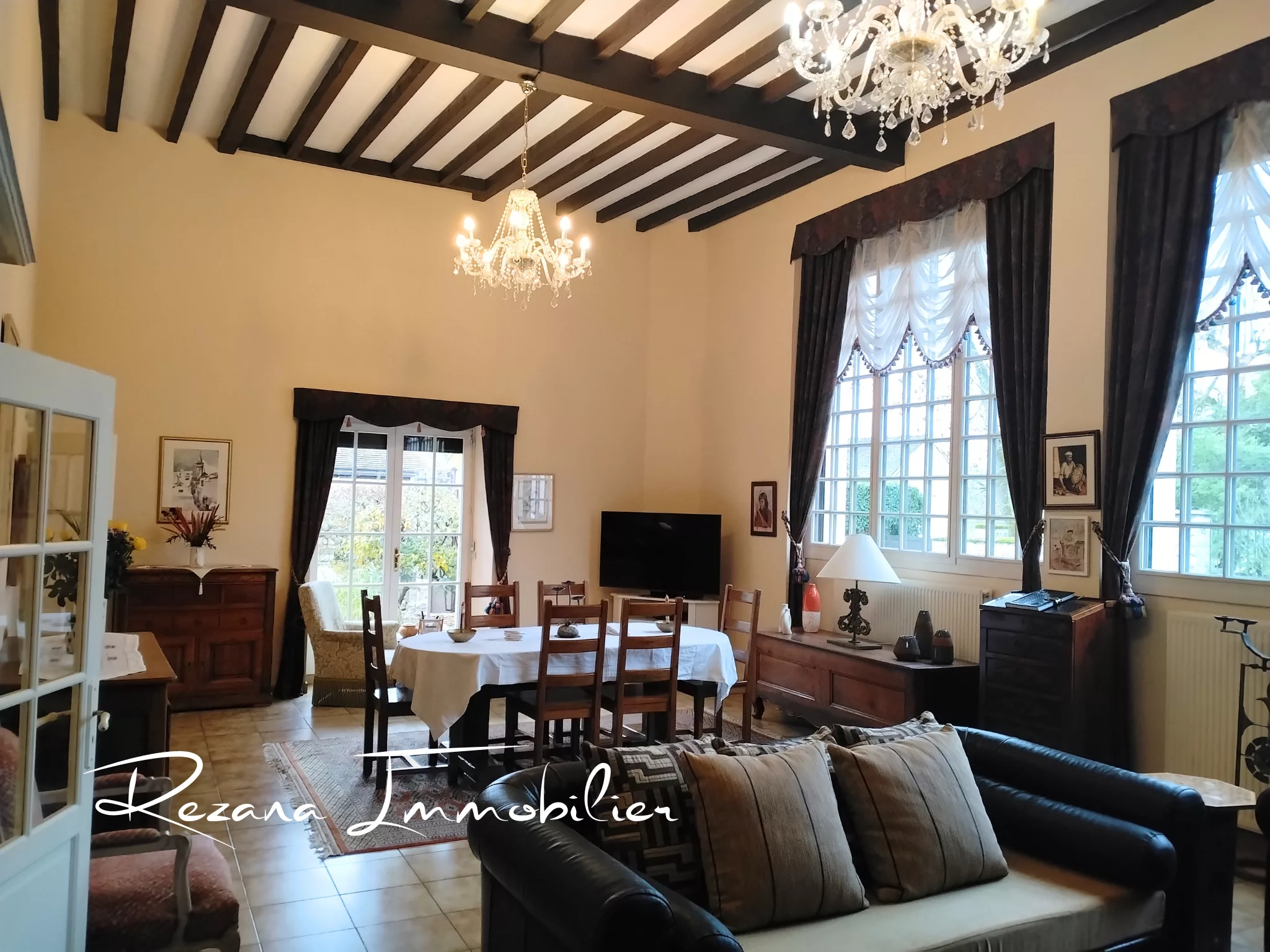 Dès l’entrée, le hall cathédrale donne le ton. La grande pièce de vie bénéficie d’une hauteur sous plafond exceptionnelle de 4,30 m et d’une élégante bibliothèque en chêne massif.